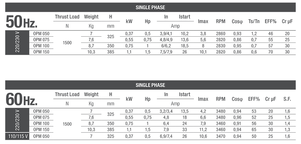Single Phase: 0.37kW (0.5hp) to 1.1kW (1.5hp), 220-230V / 50Hz (or 60Hz).